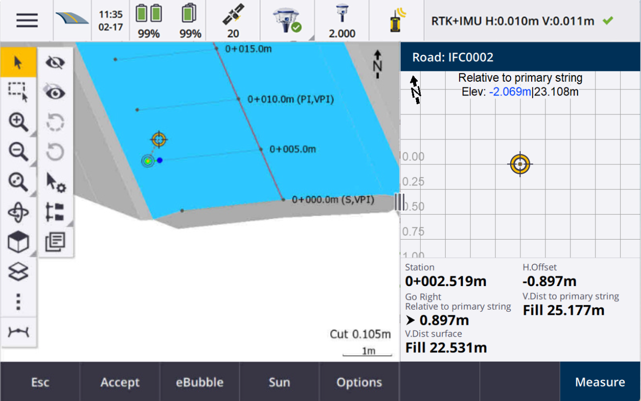 Road stakeout cut/fill: We have fixed an issue when staking a road, where the cut/fill stored in the job did not always equate to the design elevation minus the as-staked elevation. This was caused by an RTK position update happening in the instant between the time the cut/fill was calculated and the time the values were displayed on the Confirm staked deltas screen. The prior position's elevation was used to calculate the cut/fill, but the next position's elevation was displayed on the Confirm staked deltas screen and stored to the job. This resulted in the stored elevation being slightly different to what was used to calculate the cut/fill. This issue was more likely to occur if Auto store point was enabled. Typically during well converged RTK operation, the error was at the sub‑3mm (1/100th ft) level.