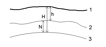 The geoid‑ellipsoid separation value (N) is obtained from the geoid model and is subtracted from the ellipsoid height (H) for a particular point. The elevation (h) of the point above mean sea level (the geoid) is the result. This is illustrated in the following diagram: