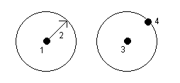 - Zmierz jeden punkt (3) w środku okręgu, a następnie zmierz drugi punkt (4), który leży na krawędzi okręgu i służy do definiowania promienia okręgu. Pierwszy punkt używa kodu kontrolnego Początek okręgu (środek) i kod obiektu liniowego, a w drugim punkcie używany jest tylko kod obiektu liniowego. Na przykład, <Kod obiektu> <Początek koła (środek)> dla pierwszego punktu, a następnie <Kod liniowy> dla drugiego punktu.