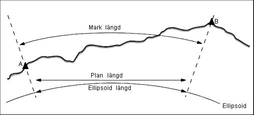 Om en ellipsoid har definierats i jobbet och Avstånds‑ fältet är inställt på Mark, beräknas avståndet parallellt med den. Om ingen ellipsoid har definierats, används WGS‑84‑ellipsoiden.