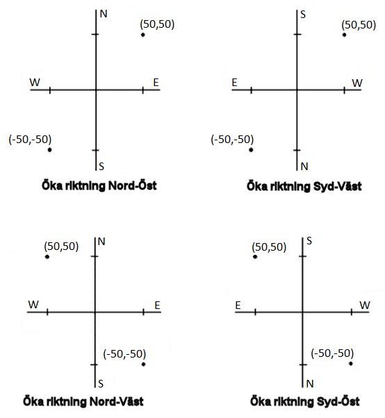 Inställningen för plankoordinaternas riktning som används av programmet beror på det koordinatsystem som du har definierat för det aktuella jobbet. Fältet Plankoordinater visar att plankoordinaterna ökar i någon av följande riktningsuppsättningar:
