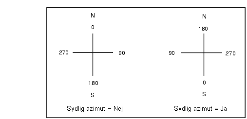 Ställ in fältet Sydazimut på Ja, om en visning av sydazimut krävs för det valda koordinatsystemet. Alla azimut ökar fortfarande medurs. Följande diagram visar effekten när fältet Sydazimut är inställt på Nej eller Ja.